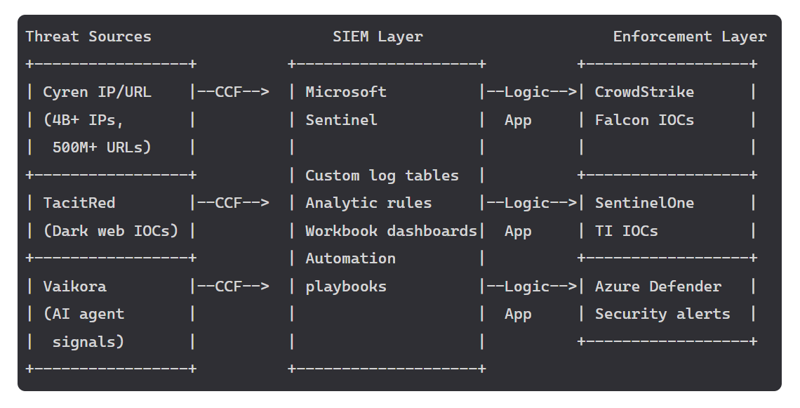 Three sources feed Sentinel through native data connectors. Sentinel stores, correlates, and evaluates. Logic App playbooks push high-confidence indicators to three enforcement targets. Each layer is independent, so you can deploy sources incrementally.